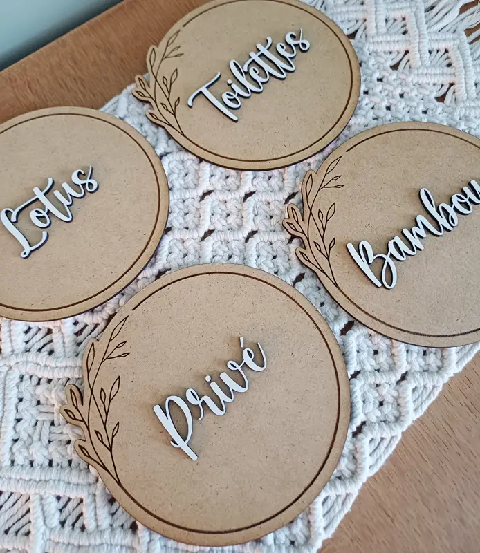 Panneau de porte rond en bois pour toutes les pièces de votre maison. L’écriture est en relief par rapport à la plaque. Graphisme feuilles ; simple et élégant. Ces plaques seront idéales pour décorer vos portes. Vous n’avez plus qu’à choisir ce que souhaitez inscrire dessus !